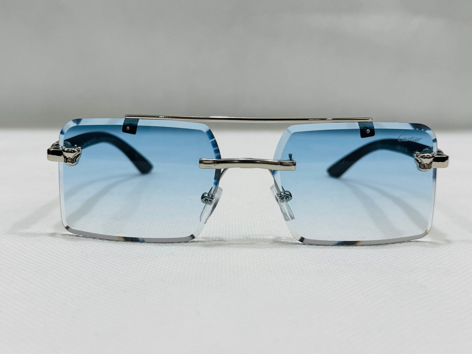 Striking silver-tone rimless sunglasses featuring oversized square lenses in a vibrant blue gradient, complete with subtle Cartier detailing at the temples for a bold luxury statement.