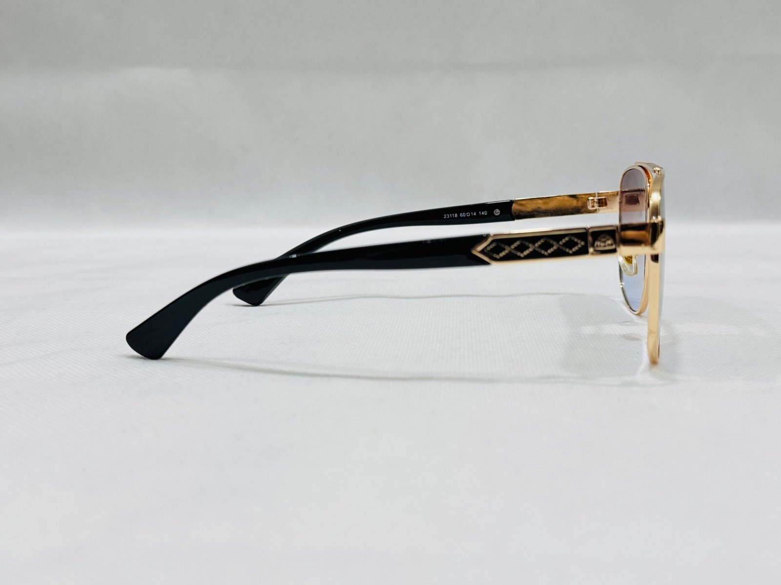 Luxurious gold-tone aviator frames with a distinctive double bridge and stunning bronze-to-sky blue gradient lenses, epitomizing high-end automotive inspired elegance.